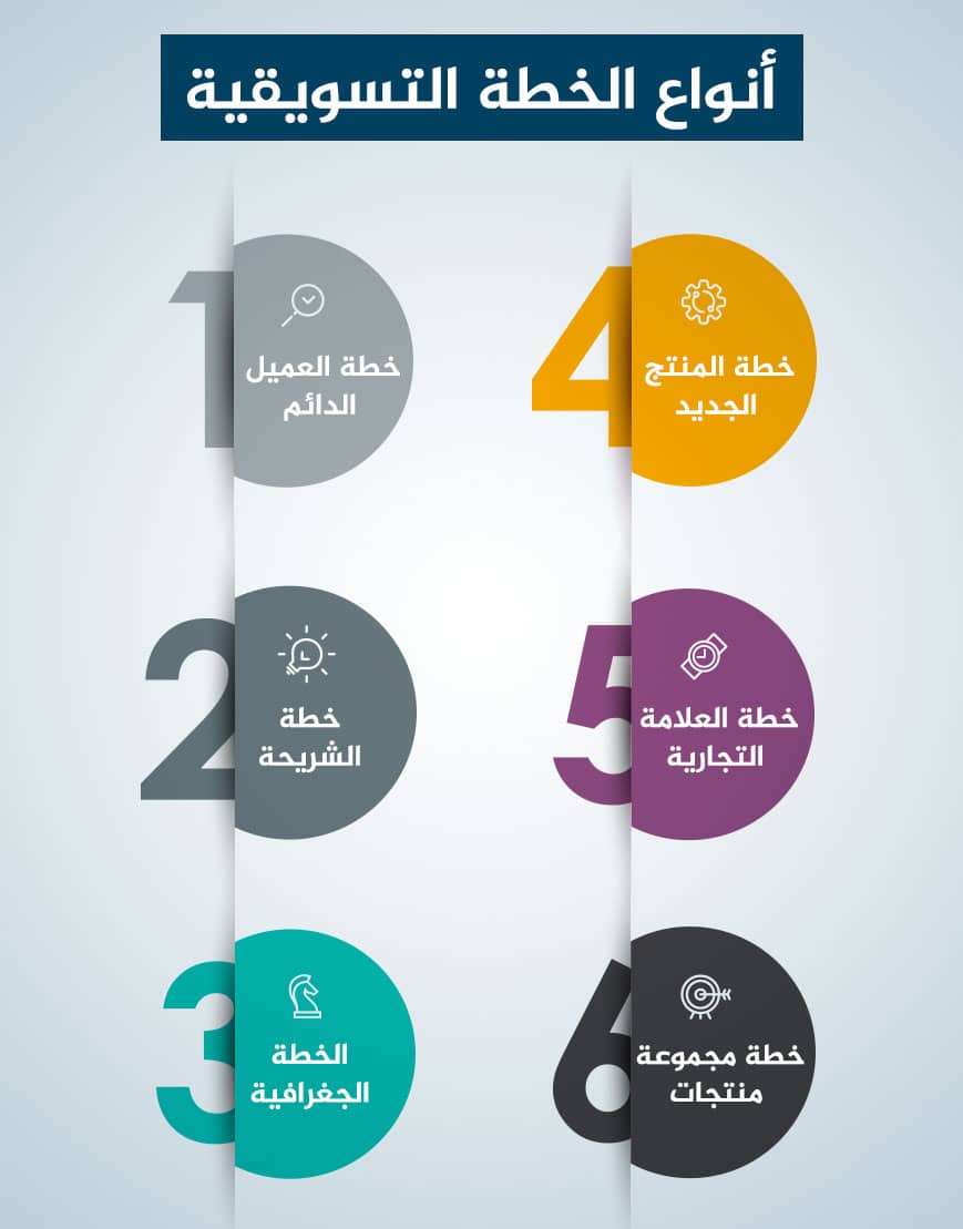 يمكن تعريف أي خطة تسويقية على أنها العمود الفقري، الذي يدعم الشركة في تحقيق أهدافها الترويجية والربحية، كما أنها النافذة التي تنجح عبرها أي شركة في الوصول إلى غاياتها التسويقية خلال فترة زمنية معينة، وهي بمثابة خطة عمل للمؤسسة أو الشركة تتمحور بشكل أساسي حول المبيعات والتسويق، وذلك من خلال إعداد خطة منظمة لتسويق المنتجات والخدمات والسلع باستخدام أحدث وأفضل التقنيات، التي تهدف إلى الوصول إلى العملاء في الأماكن والمناطق المستهدفة، كما تساعد الخطة التسويقية على زيادة معدلات الانتماء والولاء للعلامة التجارية، علاوة على أنها تعزز قيمة العلامة التجارية بالنسبة للعملاء المحتملين، ويجب أن تحدد الخطة التسويقية الأهداف التسويقية، وكيفية الوصول إليها، ووضع الشركة الحالي بين المنافسين، وتتمحور أنواع الخطة التسويقية حول: