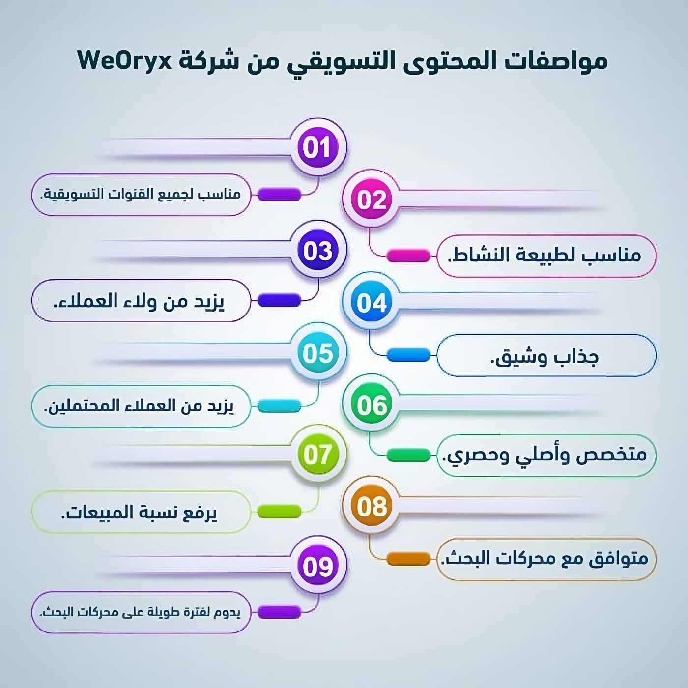 تتمتع مؤسسة WeOryx بعدد من المزايا في تقديم خدمة كتابة محتوى تسويقي، حيث أنها من الشركات الرقمية الرائدة في مصر والخليج والعالم العربي، وتمتلك الشركة الكثير من سنوات الخبرة في مجال التسويق الإلكتروني للمحتوى، والكثير من الخدمات الأخرى، كما أن لديها فريق عمل متخصص من المحررين وكتاب المحتوى والمدققين، وتهدف الشركة إلى إرضاء عملائها بشتى الطرق المشروعة، كما أنها تطبق أحدث أنظمة الجودة المتبعة عالميًا في مجال التسويق الرقمي وكتابة المحتوى التسويقي، ومن ضمن المميزات التي تجعل من الشركة الكيان الأول في تقديم مثل هذه الخدمات ما يلي: