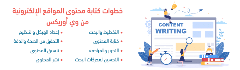 يعتبر إنشاء محتوى المواقع الإلكترونية website content من الجوانب الأساسية لنجاح الموقع، إذ يؤثر المحتوى بشكل كبير على تجربة المستخدم ومستوى رضاه عن الموقع، ولذلك، تعمل الشركات المتخصصة في التسويق الرقمي مثل شركة وي أوريكس على اتباع خطوات محددة لكتابة محتوى المواقع الإلكترونية بطريقة مميزة وجذابة للقارئ، وتشمل هذه الخطوات التخطيط والبحث، وإعداد الهيكل والتنظيم، وكتابة المحتوى، والتحقق من الصحة والدقة، والتحرير والمراجعة، وتنسيق المحتوى، والتحسين لمحركات البحث، ونشر المحتوى، ويمكن توضيح هذه الخطوات فيما يلي: